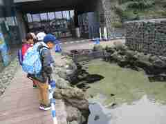 うみがたりに着いてすぐにコイやペンギンを見に行きました。その後、バックヤードの見学に行き、水族館の秘密をたくさん教えていただきました。イルカショーはお休みしているとのことでしたが、練習中のダイナミックなイルカのジャンプも見ることができました。